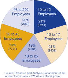 Ask the average Hoosier on the street to name three Indiana employers, and you would likely get names connected to the auto, pharmaceutical or steel industries. Certainly there are firms in these sectors that employ numerous Hoosiers at a single facility, and they are unquestionably major players in Indiana’s economy. But did you realize that the most common employment size among Indiana’s private (nongovernment) employers is one employee? Or that the median employer size (the midpoint of a distribution, where 50 percent are above and 50 percent are below) for our state is five employees? Indiana has a lot of small firms.