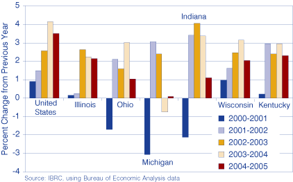 Overall, the Great Lakes region was the slowest-growing part of the nation in 2005, averaging only 1.3 percent GSP growth over 2004. Table 1 shows real GSP for Indiana and nearby states as well as the United States from 2000 through 2005, and Figure 1 indicates the percentage by which these figures changed each year. Several Midwestern manufacturing states, including Indiana, were seriously rocked by the recession and experienced negative economic growth in 2001. All of these states' economies have grown somewhat in subsequent years (except for Michigan in 2004), even though the growth rates varied significantly across the states. Indiana's growth rate led the region in 2002 through 2004, but its growth fell behind Kentucky, Illinois and Wisconsin in 2005.