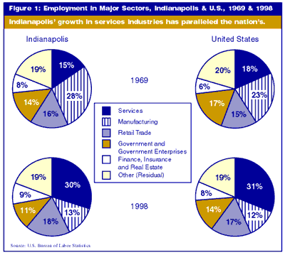 Manufacturing jobs accounted for 28% of the Indianapolis metro area employment in 1969, compared to 23% nationally (see Figure 1). By 1998, manufacturing had fallen to 13% in Indianapolis and 12% in the United States. Over the same period, service-sector employment doubled its share in the Indianapolis metro area, to 30% of all nonfarm jobs.