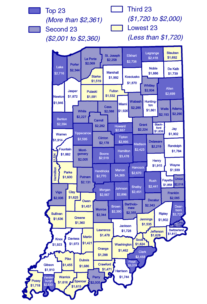 The U.S. Department of Agriculture reports that farmland in Indiana was valued at $2,064 per acre in 1997. The range extended from $5,019 in Floyd County to $1,992 in Perry County. As shown in Figure 2, the least-valued land is primarily in southern Indiana counties, while the most-valued land is in urban counties. Tipton is the only rural county in the top 13.