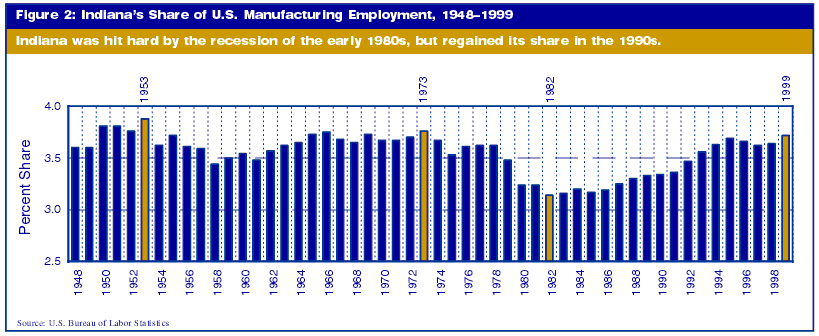 Indiana constituted 3.72% of all U.S. manufacturing employment in 1999, the only year since 1973 (3.76%) in which the state came close to reaching its 1953 level of 3.88%.