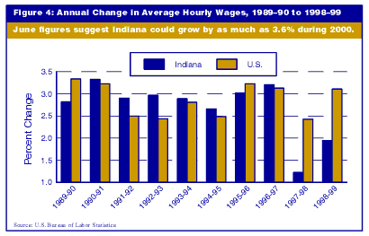 During the last decade, Indiana's manufacturing workers earned consistently more than the national average (see Figure 3). Average hourly wage rates for June 2000 were $15.81 in Indiana and $14.32 in the nation. In 1997, Indiana manufacturing workers earned an average of $1.62 more per hour than the average worker in the United States. In 1999, this difference fell back to $1.35, but in June 2000, the Indiana wage differential expanded again to $1.49. From June 1999 to June 2000, Indiana's annual average hourly manufacturing wages have increased by 3.54%. This is the highest rate of increase in the last three years, and if sustained throughout the year, will result in the highest rate since 1990.
