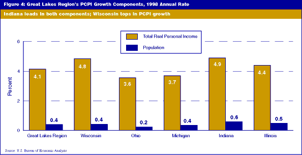 In 1998, Indiana actually led the Great Lakes region in growth rates for both personal income (4.9%) and population (0.6%), as shown in Figure 4. The result, however, was a second-place finish in the PCPI growth to Wisconsin, which had slower growth in both components (4.8% and 0.4%). In the strange race of PCPI growth, being first can sometimes lead to being second.