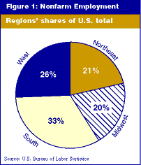 Together the South and West regions have 59% of all U.S. nonfarm jobs and 59% of the U.S. population. These two regions together now equal 0.3% more of the nation's employment than they did a year ago. The Northeast and Midwest regions' share of national employment declined by this same amount over the year. The greatest shift in employment, approximately 0.2%, was from the Midwest to the South.