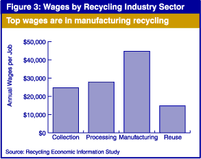 The study also shows that recycling and reuse jobs generally pay above the average state wage (see Figure 2). The average industry wage for Indiana recycling and reuse jobs is $41,200-approximately $14,000 or 52% more per year than the Indiana average wage. Figure 3 compares wages in the various recycling sectors.