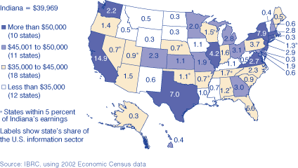 Figure 2 compares Indiana’s information sector to the rest of the nation. At $39,969, Indiana ranked 32nd in average earnings per employee. (1) Nine states came within 5 percent of Indiana’s earnings: Oklahoma, Nevada, Arkansas and Wisconsin were above Indiana, while Utah, Rhode Island, Nebraska, Tennessee and Alabama fell just short of it.