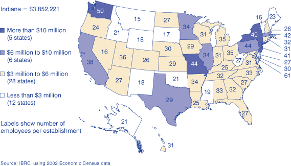 Figure 3 looks at Indiana’s second largest subsector: the publishing industry (except internet). Note that revenue data were not available for Indiana’s largest subsector—telecommunications. In the publishing industry, the state generated approximately $3.85 million per establishment, ranking 31st among the states and the District of Columbia. Indiana had approximately 31 employees per establishment engaged in publishing activities. Indiana’s immediate Midwestern neighbors were yielding greater revenues than the state in the publishing industry but were utilizing more people to do so. The exception was Kentucky, which was generating substantial revenues but utilizing fewer employees than other states. Newspaper publishers in Indiana can claim the greatest number of businesses and employment in the industry and had 45 percent of the total revenue (see Table 1).