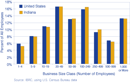 A little more than half of all Hoosiers employed in the private nonfarm sector work in business establishments with less than 100 employees. The largest size class is establishments with between 20 and 49 employees, employing 17 percent, or 432,100 people (see Figure 1).