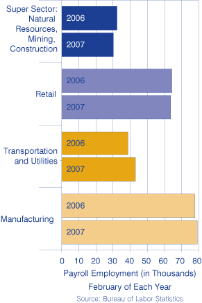 In the natural resources, mining and construction supersector, 800 jobs were lost from January 2006 to 2007. Meanwhile, February numbers show a continued decline of about 1,800 jobs (see Figure 1). The typical increase in employment for that supersector from January to January is about 2.1 percent, but this past year showed a 2.5 percent decline (see Figure 2).