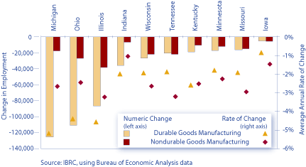 Click for larger imageFigure 3 shows why the Midwest in general and the states of Michigan, Ohio and Illinois in particular, have had such disappointing job growth. Michigan, Ohio and Illinois were hard hit in both the rate of job loss as well as in absolute numbers in the manufacturing sector. Michigan, for example, lost over 125,000 jobs from 2001 to 2005 in durable goods manufacturing. The loss of jobs in nondurable goods was not as dramatic.