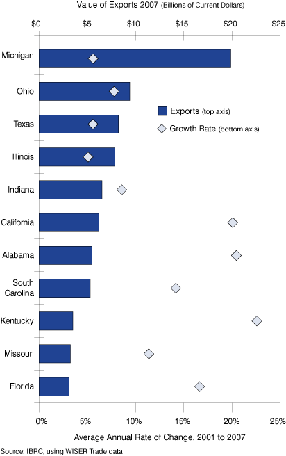 Whether Indiana can maintain the number five spot into the future is an open question. Figure 3 shows a significant re-alignment of vehicle exports among the states. The top five states have had similar growth rates from 2001 to 2007, but the states ranked sixth through eleventh have had growth rates that are twice those of the Great Lake states (and Texas).