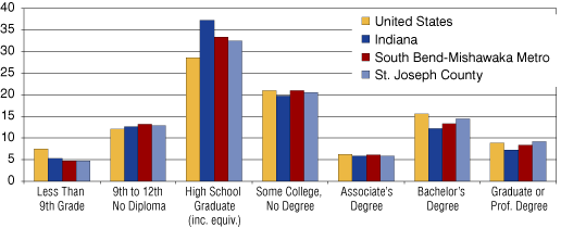 Although the South Bend-Mishawaka metro has nine1 colleges and universities in the area (including the University of Notre Dame), just 48.8 percent of the population has greater than a high school education, slightly less than the nation (51.7 percent) but more than Indiana (44.9 percent). It is no surprise that St. Joseph County has a higher proportion of bachelor, graduate or professional degrees than the rest of the metro as nearly 89 percent of the colleges and universities are in the county (see Figure 2).