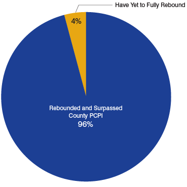 By 2011, 96 percent of Indiana counties had not only returned to their 2008 per capita personal income (PCPI) levels, they had surpassed them. The positive county growth percentages ranged from 0.04 percent to 13.6 percent. Four counties proved particularly resilient during the recession and the generally slow recovery and posted year-over-year growth in PCPI from 2008 to 2011 (see Figure 1).