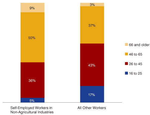 Comparing the age distribution of self-employed workers to that of other employees suggests that the self-employed tend to be older than other workers (see Figure 2). Self-employment seems to become more common as workers enter their 40s and remains relatively popular up to and beyond typical retirement ages.