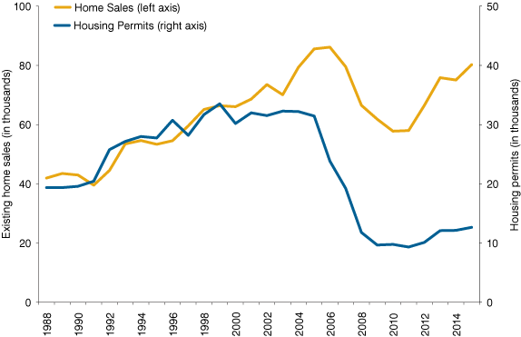 While there have been modest gains in 2016, residential construction is still weak by historical standards. The gap between the number of existing home sales and permits for new single-family homes highlights the extent to which construction is lagging. From 1988 to 2005, there was a fairly consistent ratio of approximately two existing home sales for each single-family housing permit in Indiana (see Figure 5). In 2015, however, that ratio was roughly six-to-one. This gap has held steady so far in 2016, as the boost in construction has been matched by an uptick in existing home sales.