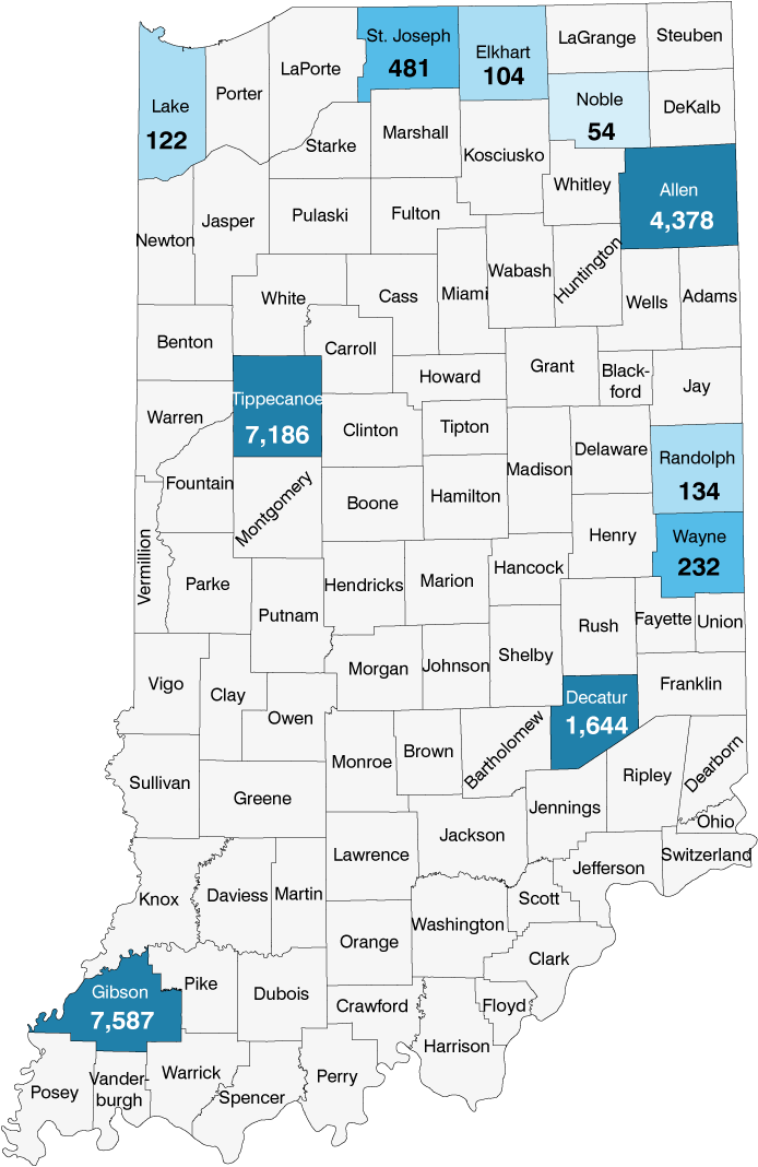 | Tippecanoe | 3361 | Motor vehicles | $2,067,824,443 | 7,186 | $83,389 |