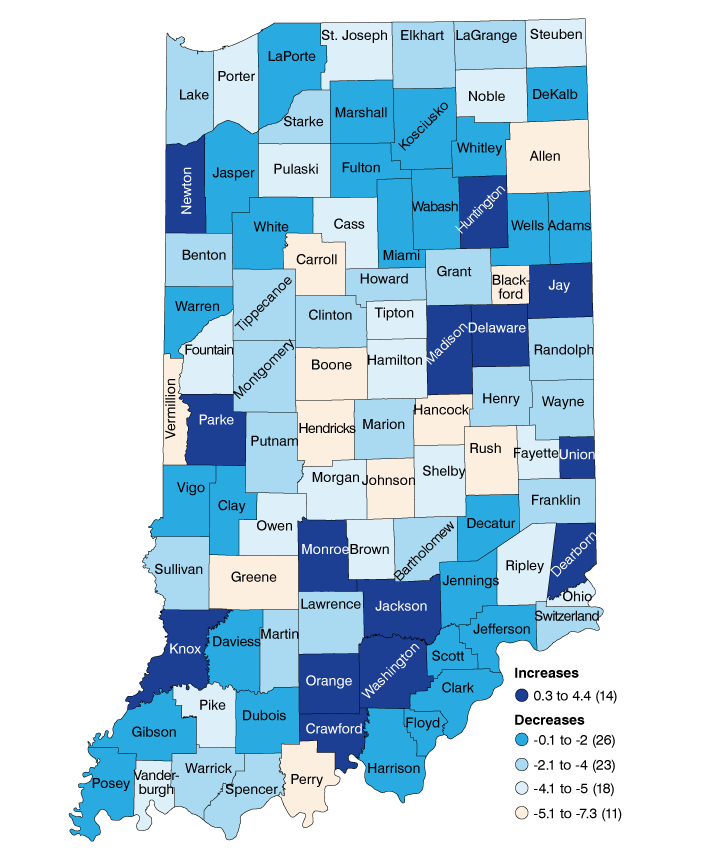 When compared to the momentous election in 2020, 78 of Indiana’s 92 counties registered a lower turnout rate in 2024 (see Figure 3). Topping the list of 14 counties with higher voter turnout in 2024 is Jackson County, recording a voter turnout rate that was 4.4 percentage points higher than 2020. Jackson County was followed by Madison (+3.9 percentage points), Parke (+3.5), Delaware (+3.2) and Union (+3.1) counties. Voter turnout decreased by more than five percentage points in 11 counties, extending to down 7.3 percentage points in Hendricks County in 2024. The vast majority of Indiana counties recorded voter turnout that decreased between 0.1 and 5 percentage points in the 2024 election (as compared to the 2020 election).Figure 3: Change in Indiana county voter turnout from 2020 to 2024